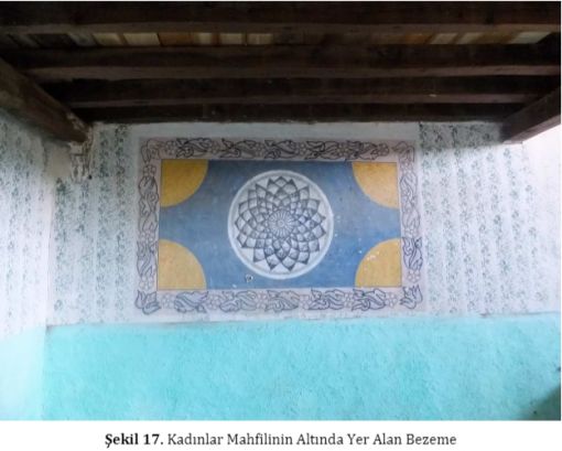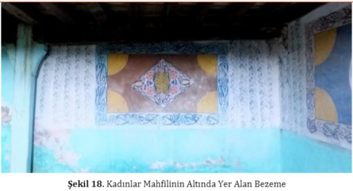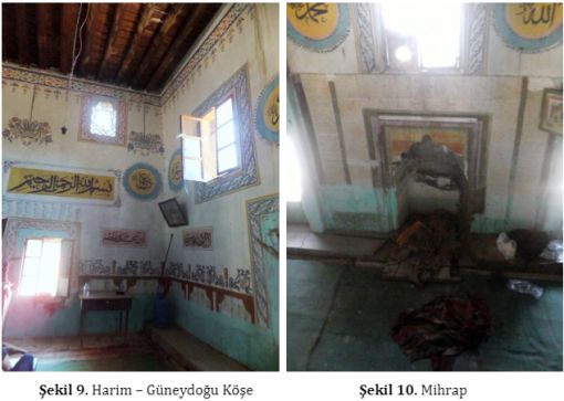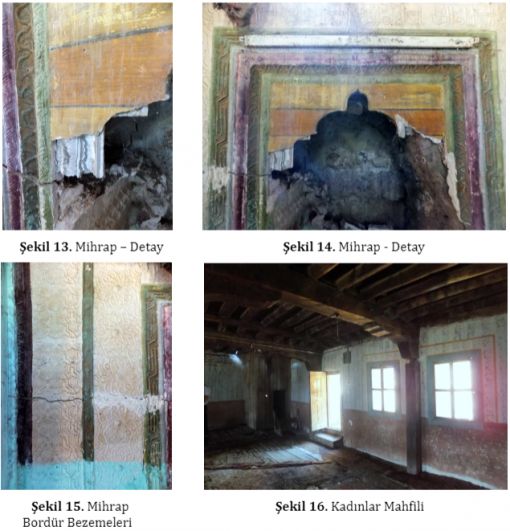 Eserin oldukça tahrip olmuş mihrabı, alçı malzeme ile yapılmıştır (Şekil 10). Kemer köşelikleri boyanan mihrabın en dış çevresinde yer alan içbükey silme bitkisel motiflerle, yanındaki dışbükey silme zikzak motifiyle bezenmiştir. Bu silmelerden sonra gelen geniş bordür, kırık çizgilerle elde edilmiş geometrik motiflerle bezenmiştir (Şekil 15)