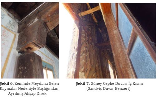 Caminin beden duvarlarında, ahşap hatıllar ve kerpiç malzeme kullanılırken, temelinin görünen kısımlarında moloz taş ve düzgün olmayan kesme taşın kullanıldığı tespit edilmiştir (Şekil 3-5). Buna ek olarak eserin güney duvarının sandviç duvar tekniğine benzer bir teknik le inşa edildiği görülmektedir. İç ve dış panellerden oluşan bu tekniğin sadece güney cephede